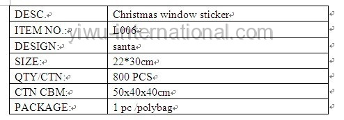 this L006 santa window sticker–christmas window sticker which use the PVC material, has good quality and reasonable price.Yiwu International Trade Co.,Ltd can provide you christmas deccoration, christmas oranments,candle holder, christmas gift, christmas ball and so on.welcome to connect us.