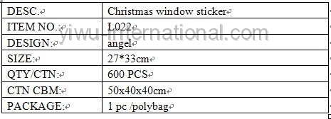 this L022 angel window sticker–christmas window sticker which use the PVC material, has good quality and reasonable price.Yiwu International Trade Co.,Ltd can provide you christmas deccoration, christmas oranments,candle holder, christmas gift, christmas ball and so on.welcome to connect us.