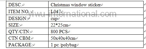 this L047 cup window sticker–christmas window sticker which use the PVC material, has good quality and reasonable price.Yiwu International Trade Co.,Ltd can provide you christmas deccoration, christmas oranments,candle holder, christmas gift, christmas ball and so on.welcome to connect us.