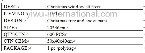 this L071 pvc sticker–christmas window sticker which use the PVC material, has good quality and reasonable price.Yiwu International Trade Co.,Ltd can provide you christmas deccoration, christmas oranments,candle holder, christmas gift, christmas ball and so on.welcome to connect us.