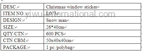 this L073 glass window sticker–christmas window sticker which use the PVC material, has good quality and reasonable price.Yiwu International Trade Co.,Ltd can provide you christmas deccoration, christmas oranments,candle holder, christmas gift, christmas ball and so on.welcome to connect us.