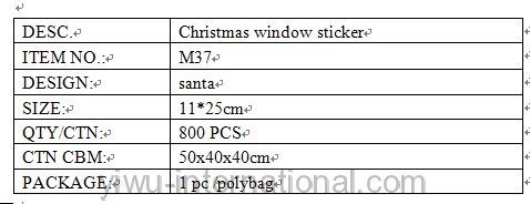 this M037 window pvc sticker–christmas window sticker which use the PVC material, has good quality and reasonable price.Yiwu International Trade Co.,Ltd can provide you christmas deccoration, christmas oranments,candle holder, christmas gift, christmas ball and so on.welcome to connect us.