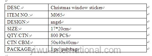 this M065 angel sticker–christmas window sticker which use the PVC material, has good quality and reasonable price.Yiwu International Trade Co.,Ltd can provide you christmas deccoration, christmas oranments,candle holder, christmas gift, christmas ball and so on.welcome to connect us.