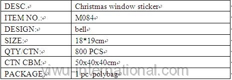 this M084 bell pvc sticker–window sticker which use the PVC material, has good quality and reasonable price.Yiwu International Trade Co.,Ltd can provide you christmas deccoration, christmas oranments,candle holder, christmas gift, christmas ball and so on.welcome to connect us.