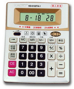Description:Our kadio KD-5122TA-1 talking calculator is electronic calculator,also is an office supply with many function,has good quality and reasonable price.Yiwu International Trade Co.,Ltd. specialized in producing mini calculator,multifunctional calculator,pocket calculator,clock,electronic clock,LED clock,cartoon clock and so on, welcome to connect us Yiwu International Trade Co.,Ltd..